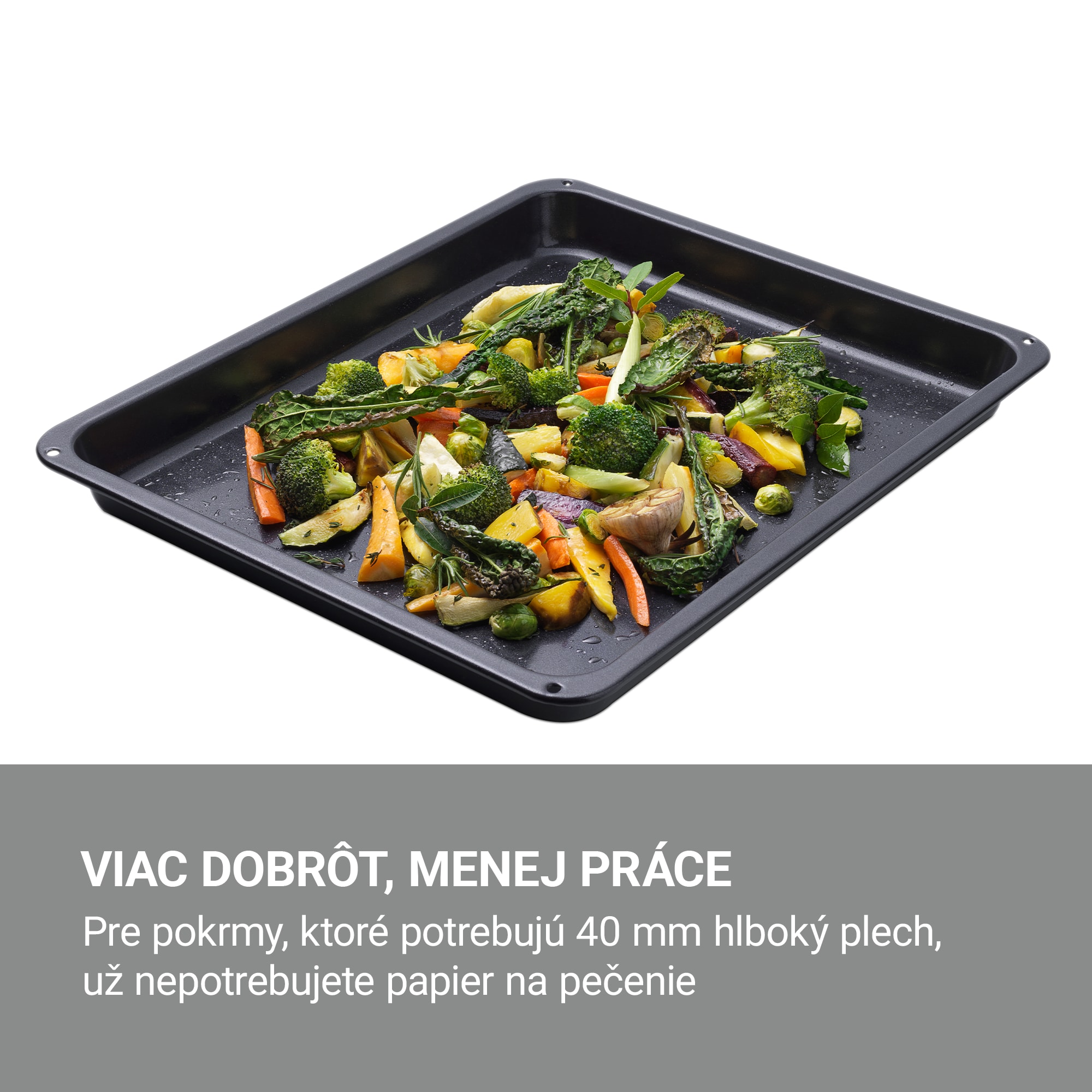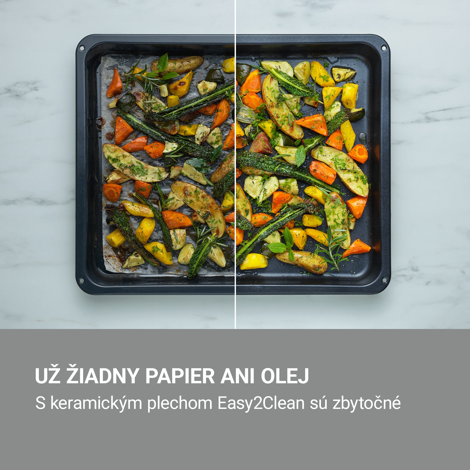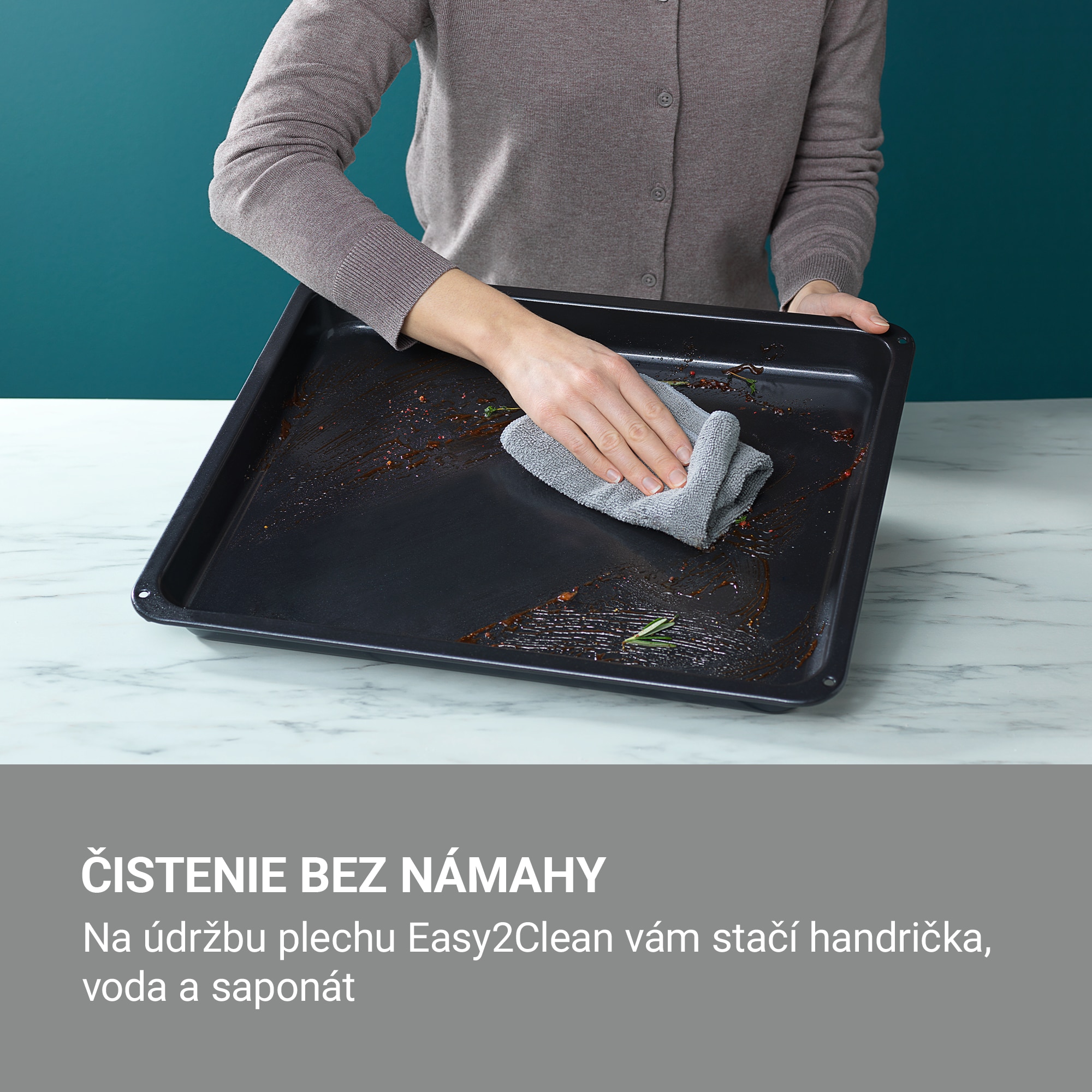 Umiestnite jedlo priamo na hlboký podnos Easy2Clean. Jeho keramický povlak zabraňuje prilepeniu jedla na podnos, čím eliminuje potrebu papiera na pečenie alebo ďalšieho olejovania. Je ľahké umývať vlhkou handričkou, teplou vodou a mydlom na riad.