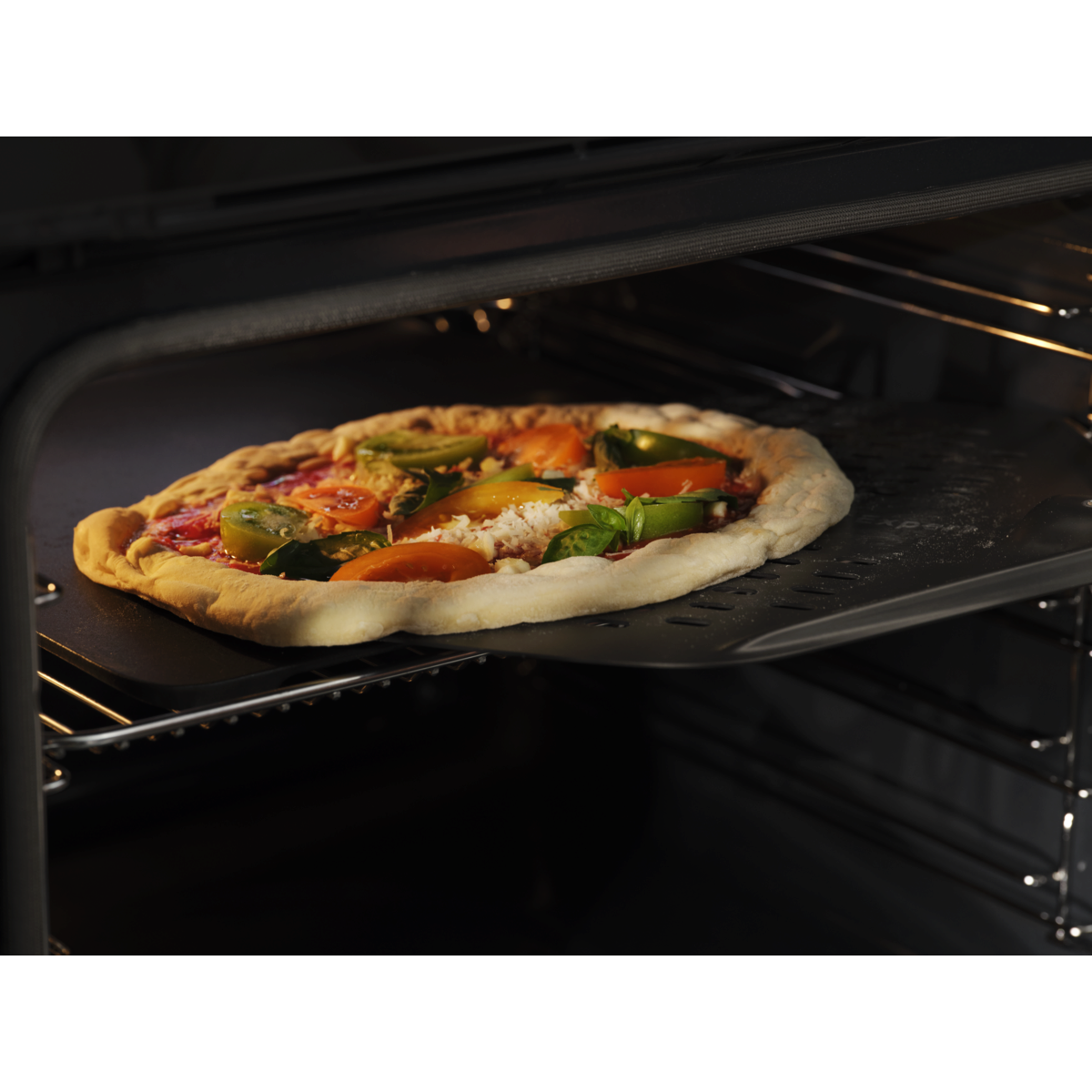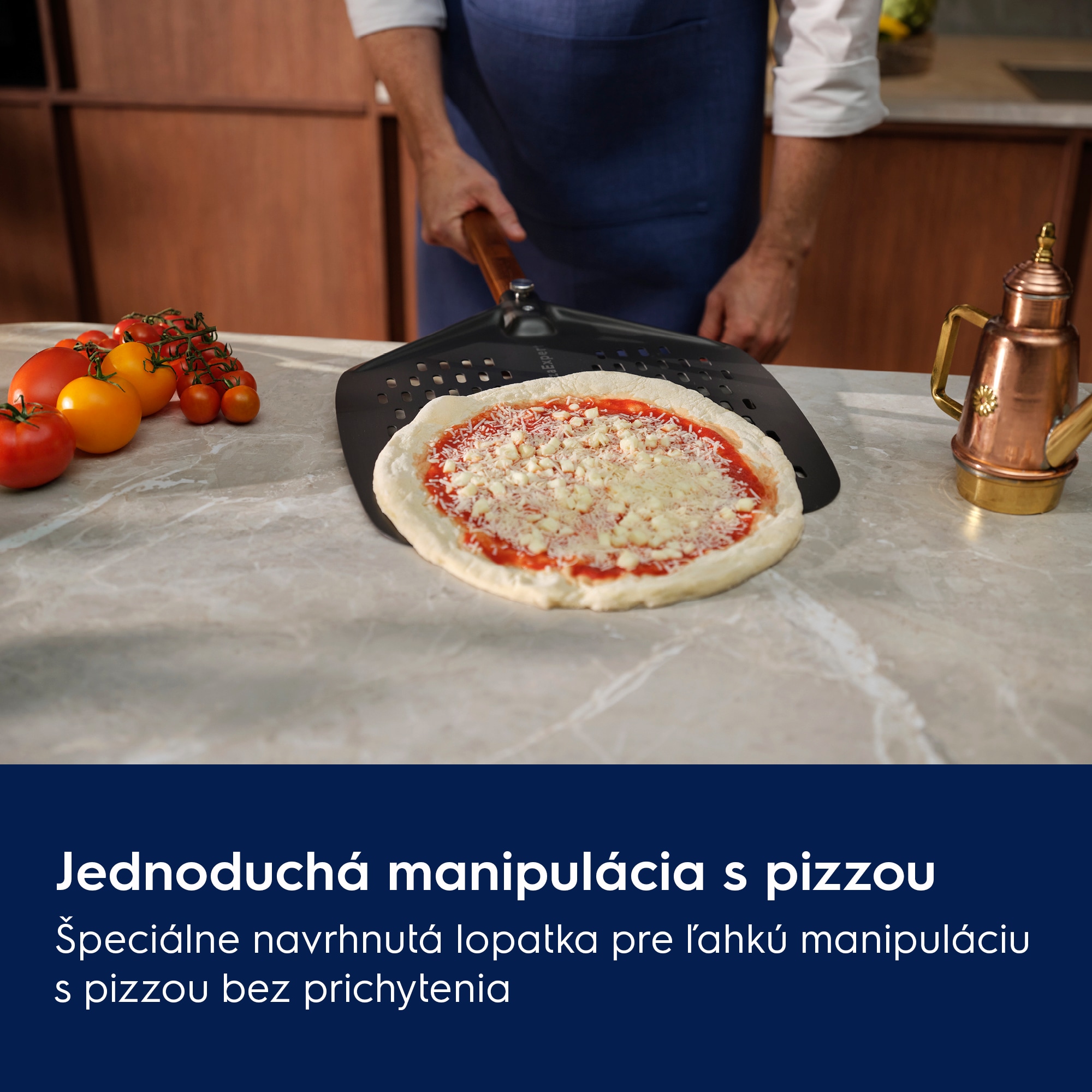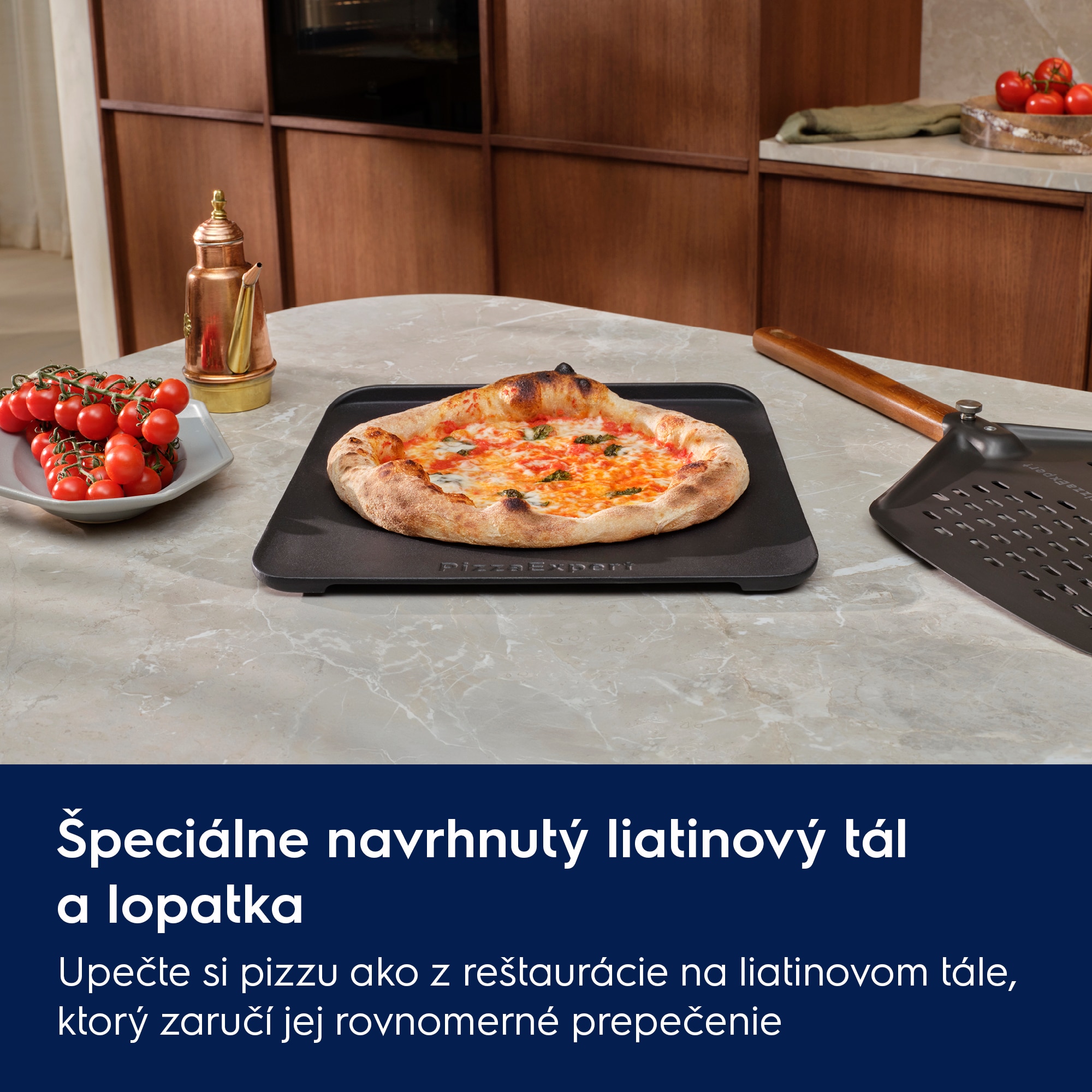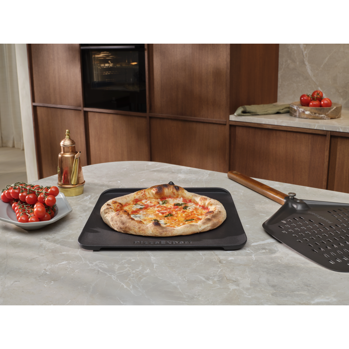 Súprava PizzaExpert: Dva doplnky, ktoré zaručia vždy rovnaký výsledok. Liatinový plech špeciálne navrhnutý tak, aby odolal pečeniu pri teplote 340 °C. A navyše perforovaná lopatka na pizzu, ktorá obmedzuje prilepenie a uľahčuje manipuláciu s pizzou.
