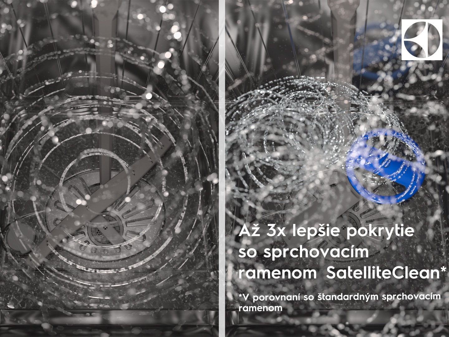Sprchovacie rameno SatelliteClean® sa postará o maximálne pokrytie a dosahuje až 3-násobne lepšie výsledky ako je bežné. Dve rotujúce ramená neustále menia uhol ostreku, aby váš riad žiaril čistotou.