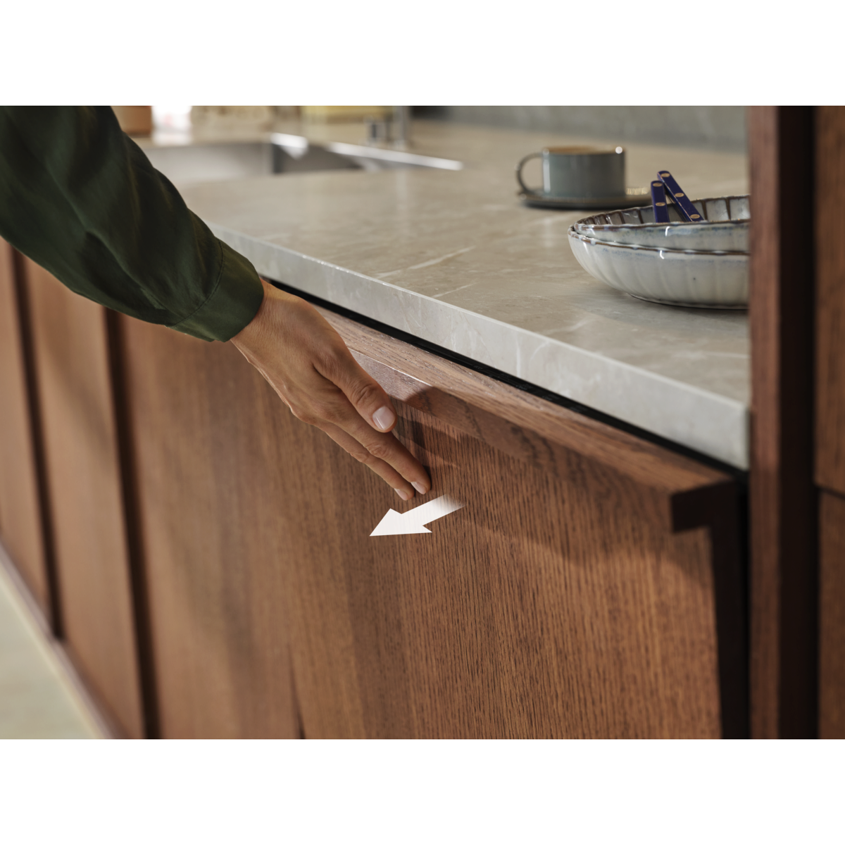 Vďaka dvierkam Push2Open bez rukoväte   splynie umývačka dokonale s kuchynskou linkou. Na otvorenie umývačky len jemne zatlačíte v hornej časti dvierok.