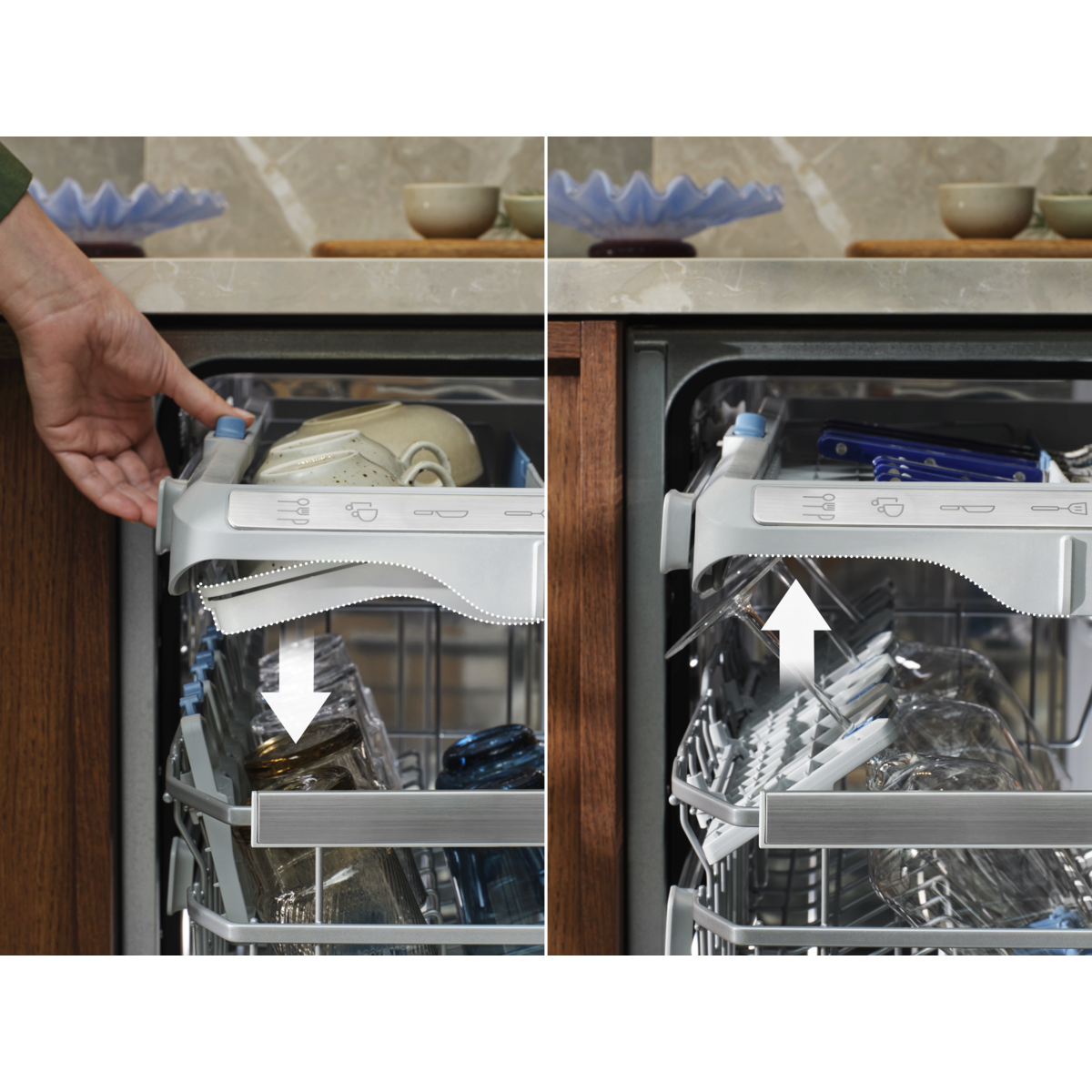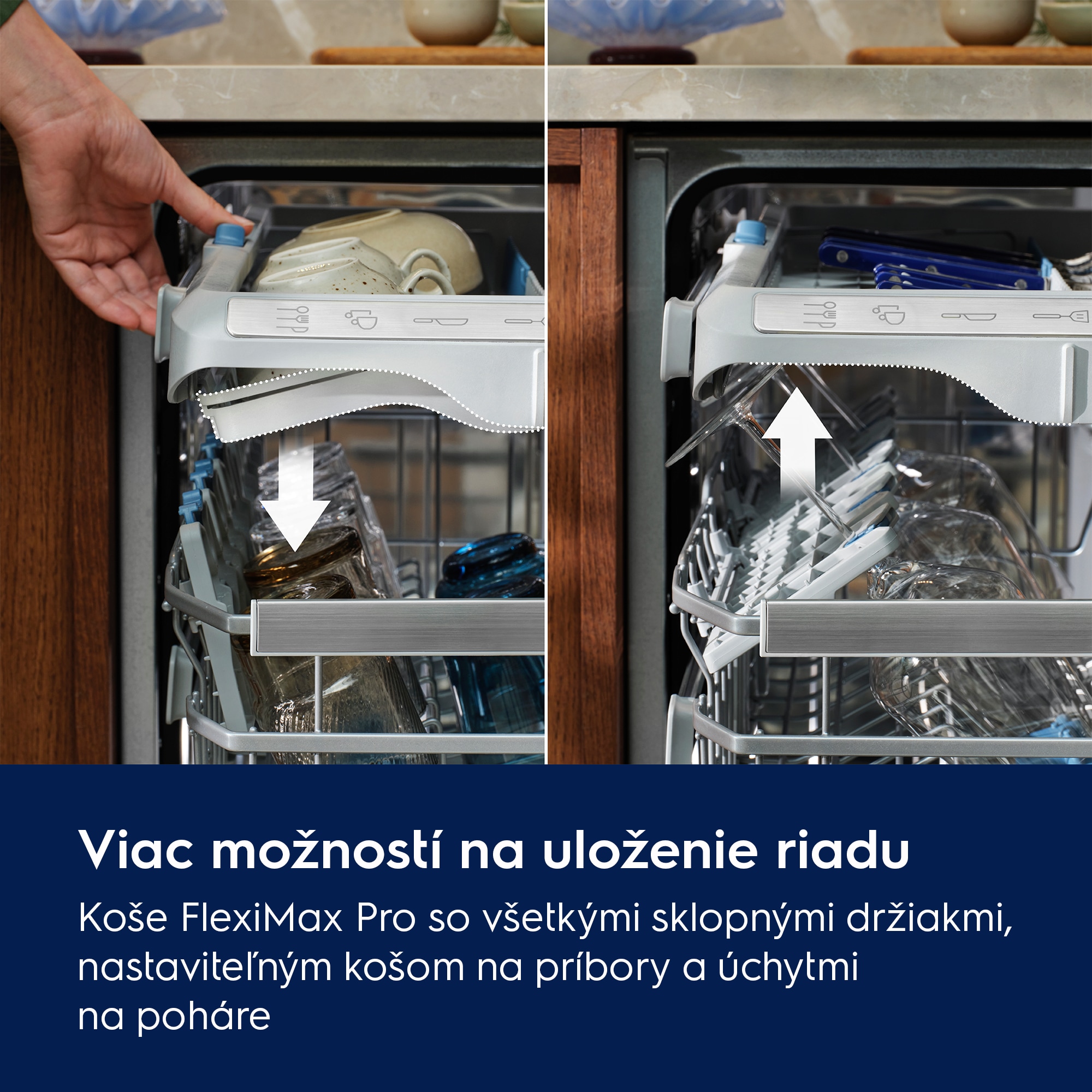 Pre maximálnu flexibilitu sa dajú sklopiť všetky držiaky. V oboch košoch FlexiMax Pro zároveň protišmykové gumené úchyty a hroty zaistia poháre na stopke aj bežné poháre a ochránia ich pred vzájomnými nárazmi. Do zásuvky na príbor sa zmestia metličky, naberačky aj malé šálky.