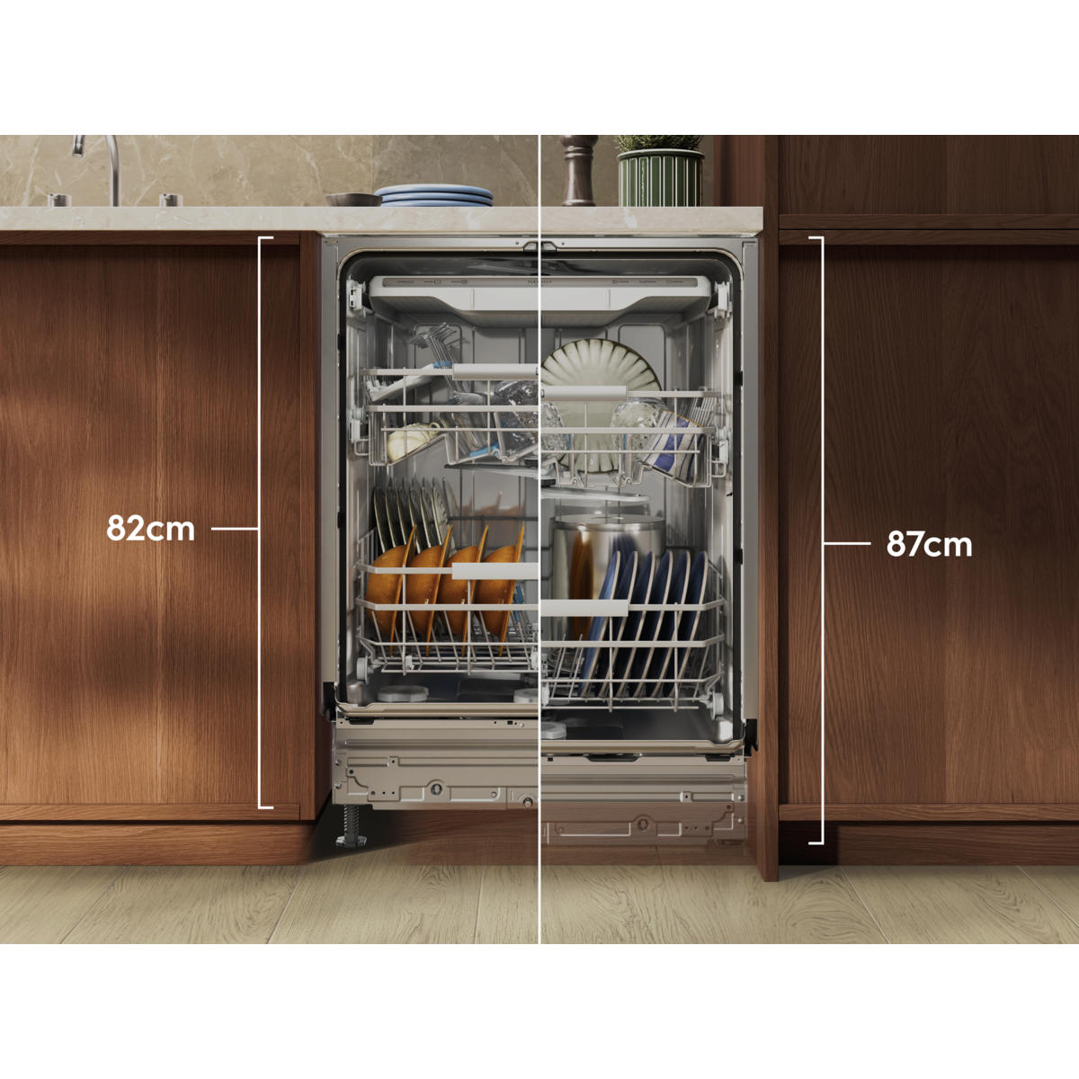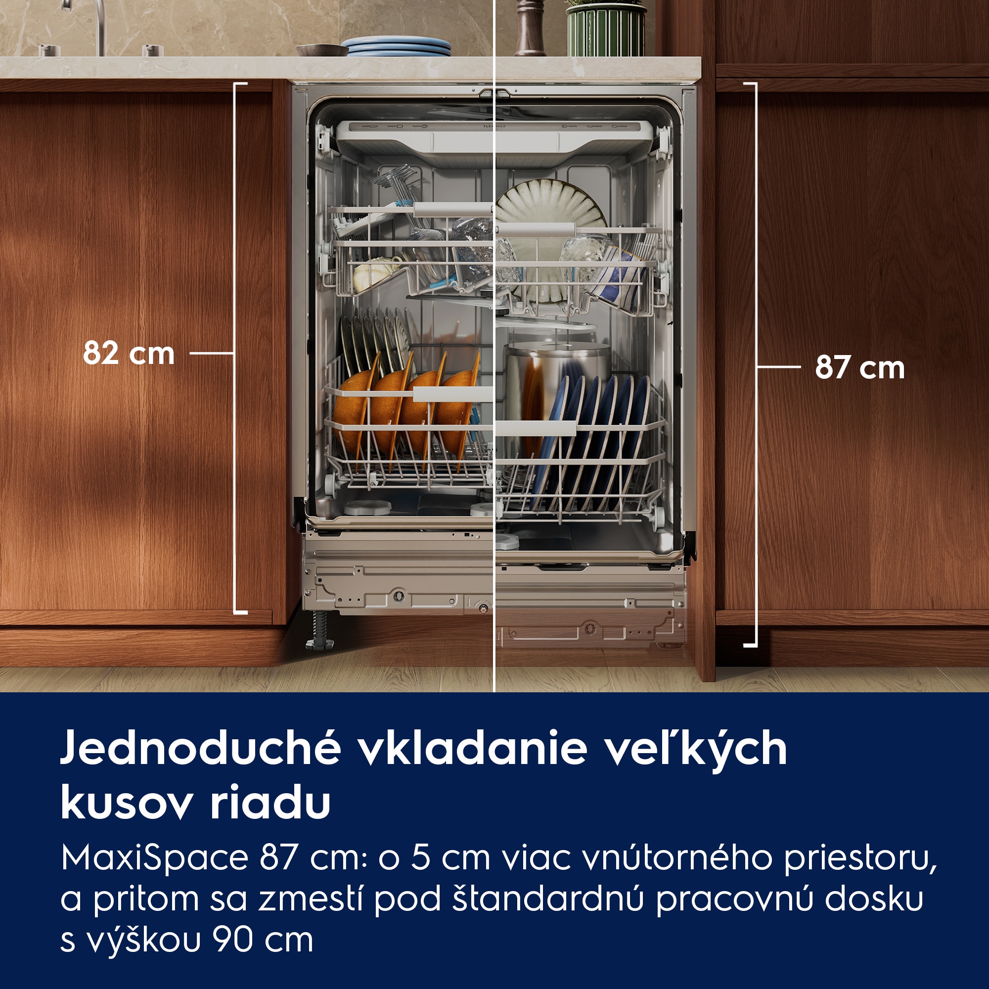 Do modelov MaxiSpace ľahšie vložíte aj veľké kusy riadu vďaka vnútornému priestoru, ktorý je o 5 cm vyšší. Kratšie nohy umožňujú umývačku umiestniť pod štandardnú kuchynskú linku s výškou 90 cm. Riad bude dokonale čistý so spotrebou vody len 8,4 l, rovnako ako v štandardnom modeli.