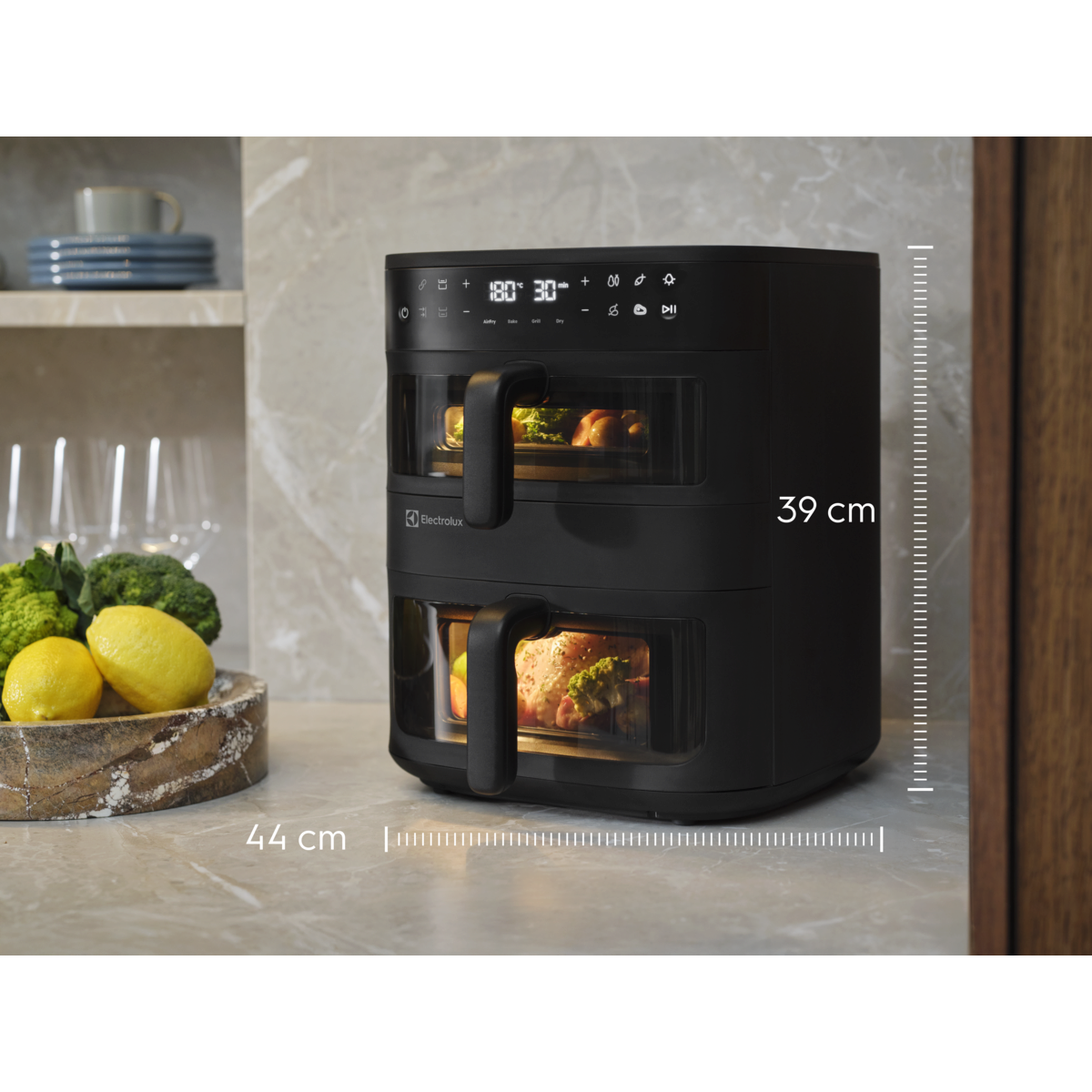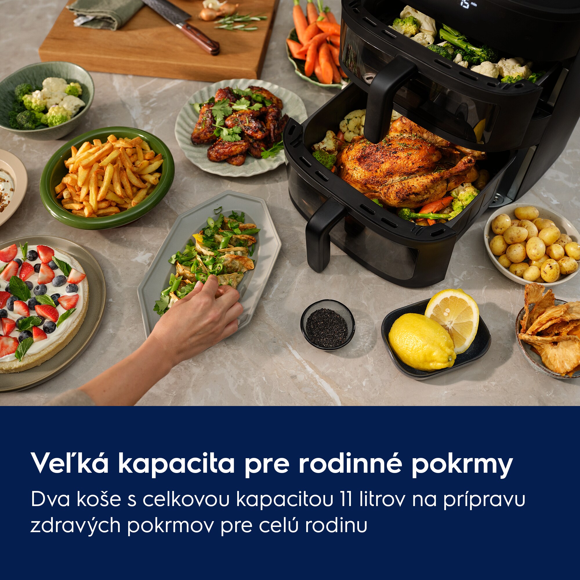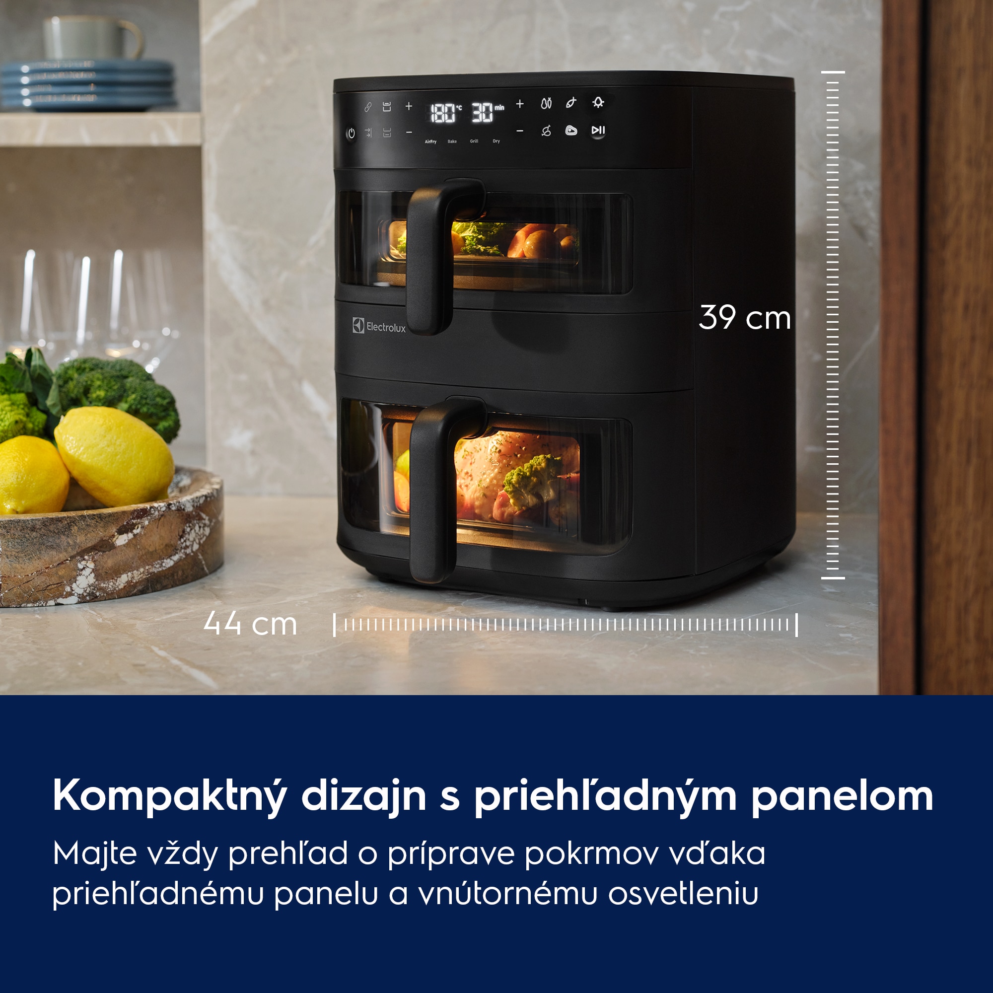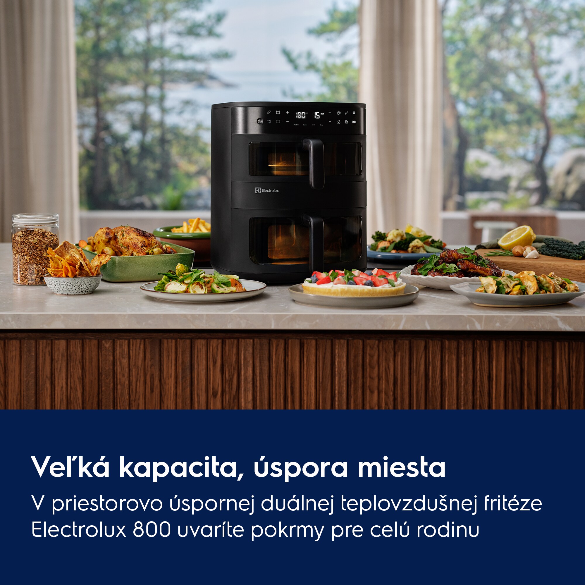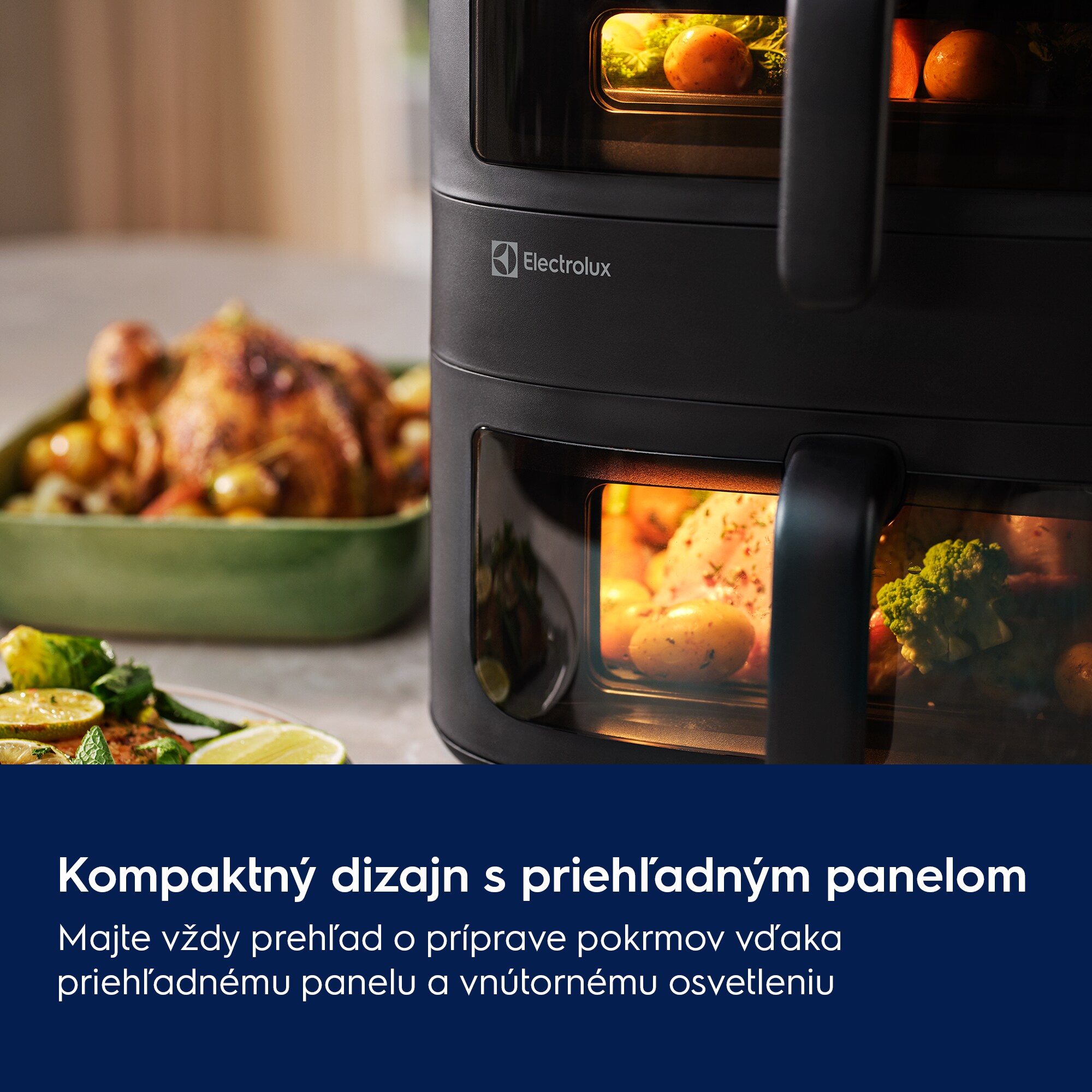 Pripravujte jedlá pre celú rodinu s teplovzdušnou fritézou Electrolux 800 Dual. Dva vertikálne koše a priehľadné okienka s vnútorným osvetlením umožnia sledovať dve rôzne jedlá alebo jednu veľkú porciu. Rovnomerné prúdenie tepla zaistí skvelé výsledky v elegantnom a priestorovo úspornom dizajne.