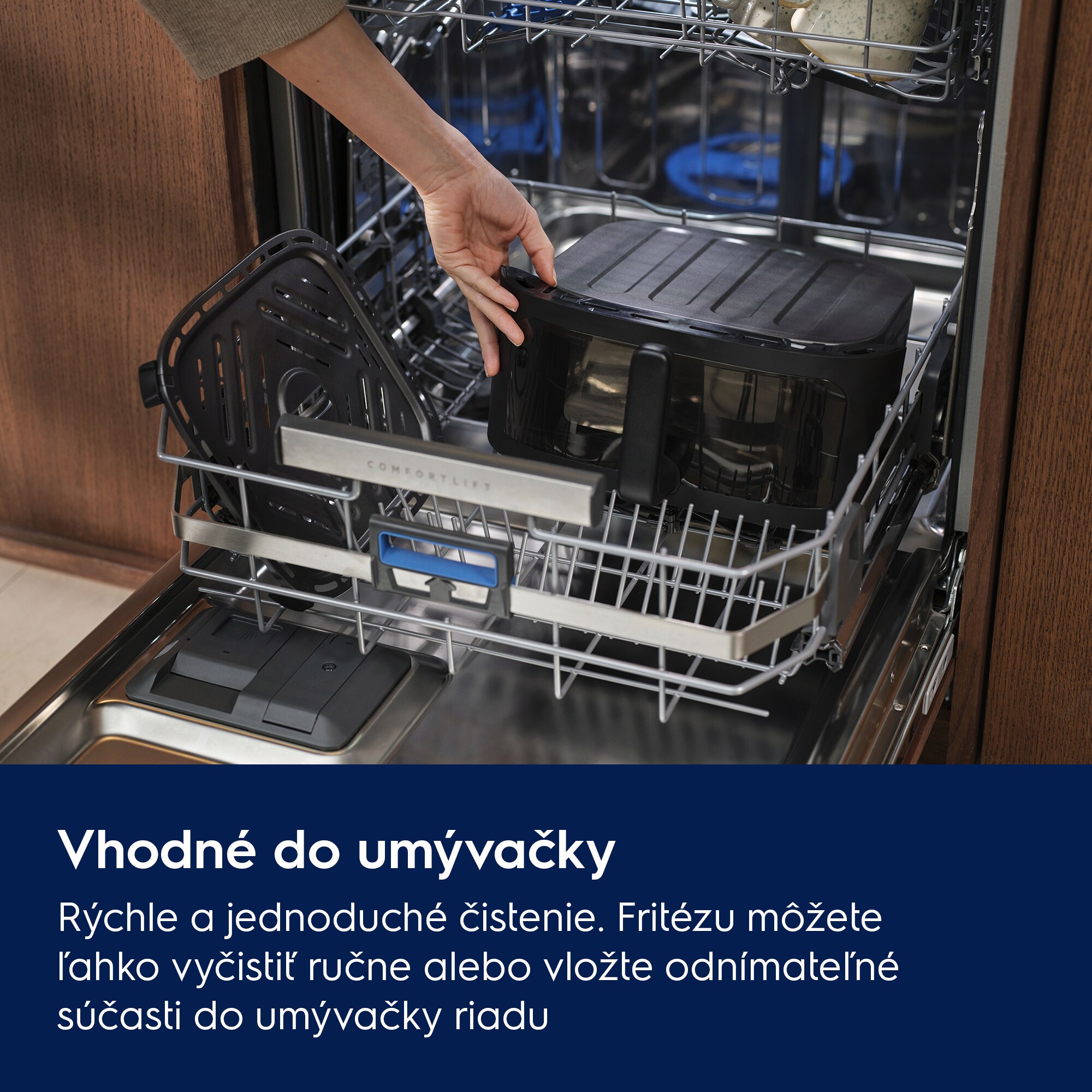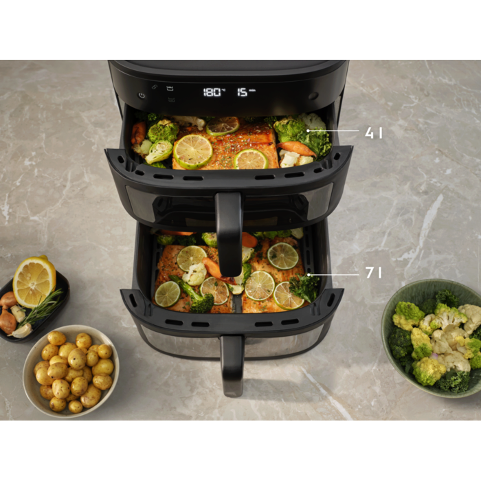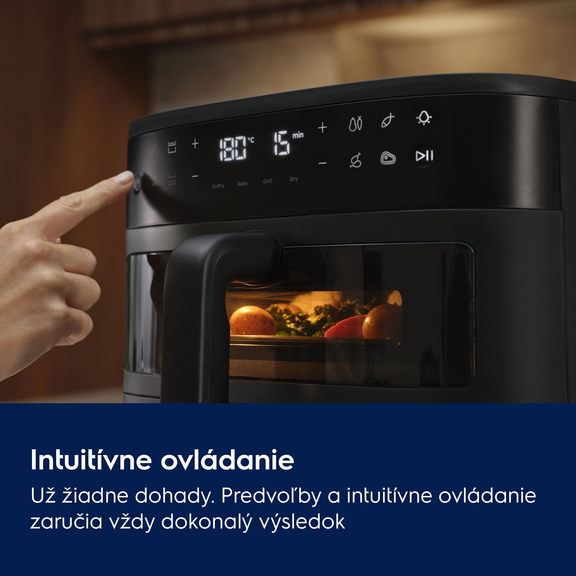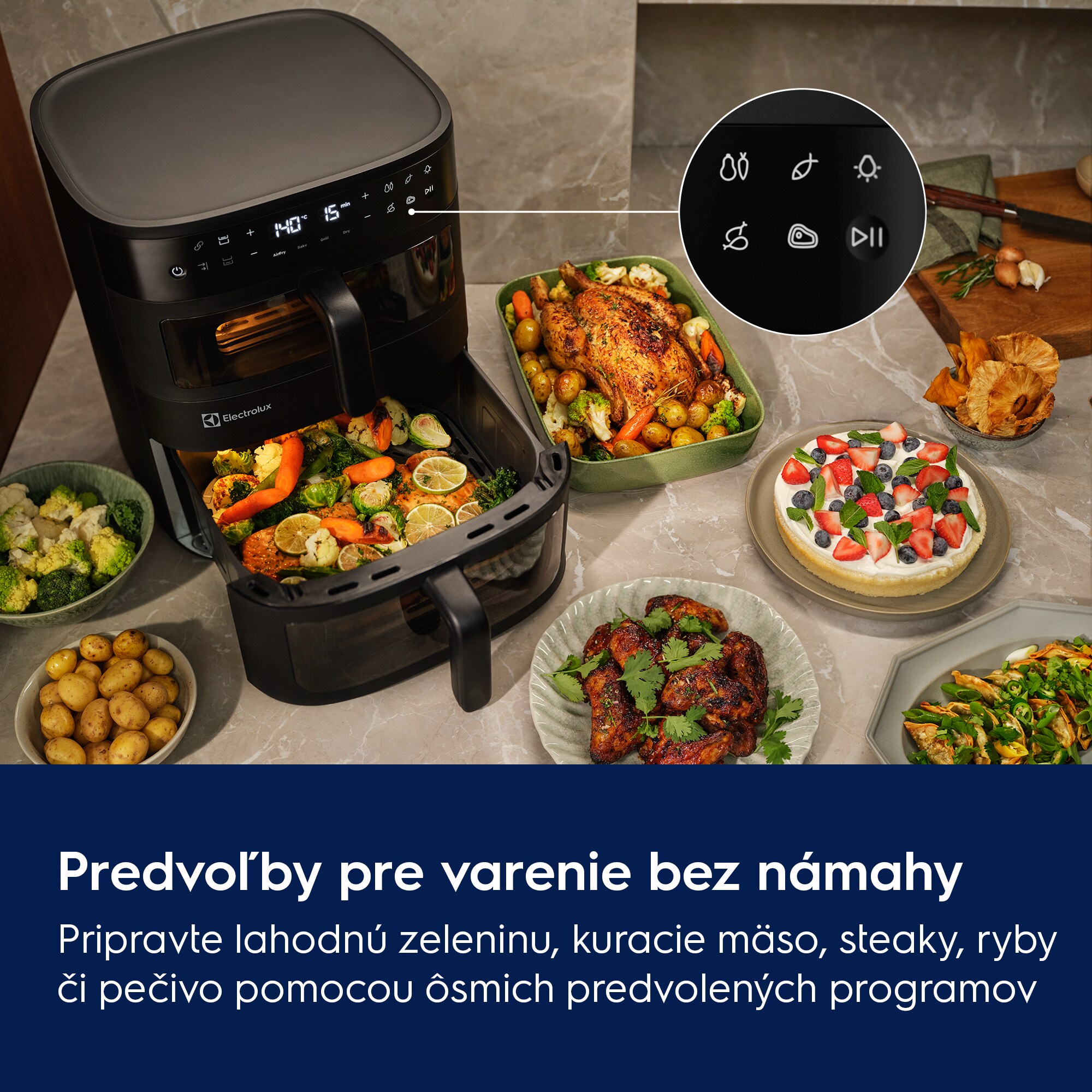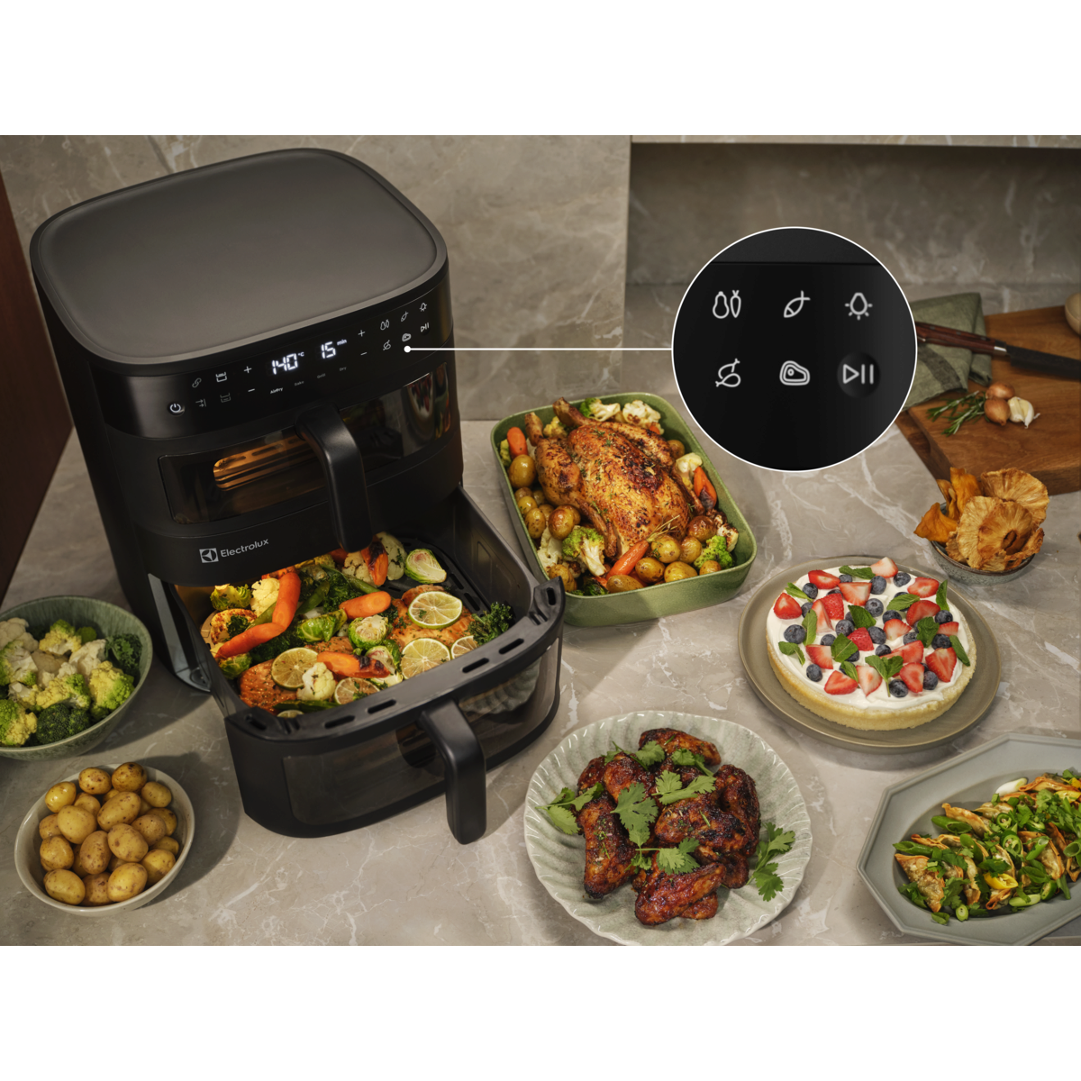 Pripravujte jedlá pre celú rodinu s teplovzdušnou fritézou Electrolux 800 Dual. Dva vertikálne koše a priehľadné okienka s vnútorným osvetlením umožnia sledovať dve rôzne jedlá alebo jednu veľkú porciu. Rovnomerné prúdenie tepla zaistí skvelé výsledky v elegantnom a priestorovo úspornom dizajne.
