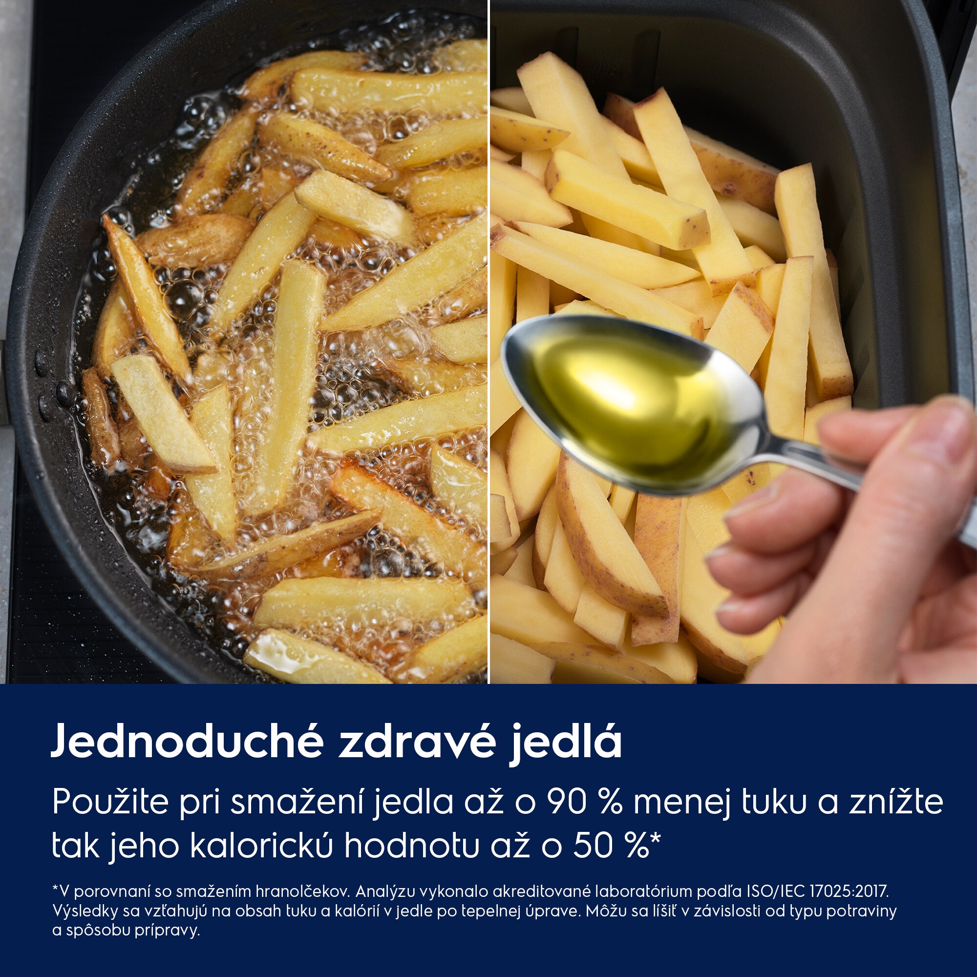 **Na základe interného testovania, pri ktorom sa porovnávala vnútorná teplota klobás pripravovaných v jednej vrstve oproti dvom vrstvám v modeli EAF5B. Skutočné výsledky sa môžu líšiť v závislosti od typu potraviny, množstva a spôsobu prípravy.“