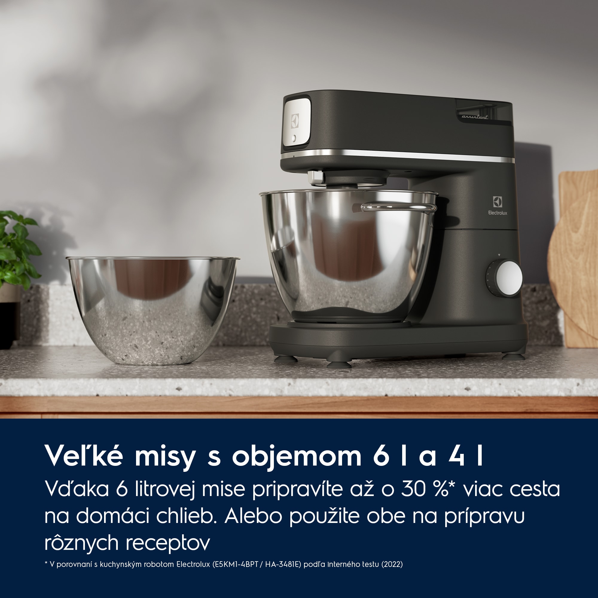 ** V porovnaní s kuchynským robotom Electrolux (E5KM1-4BPT / HA-3481E) podľa interného testu (2022)