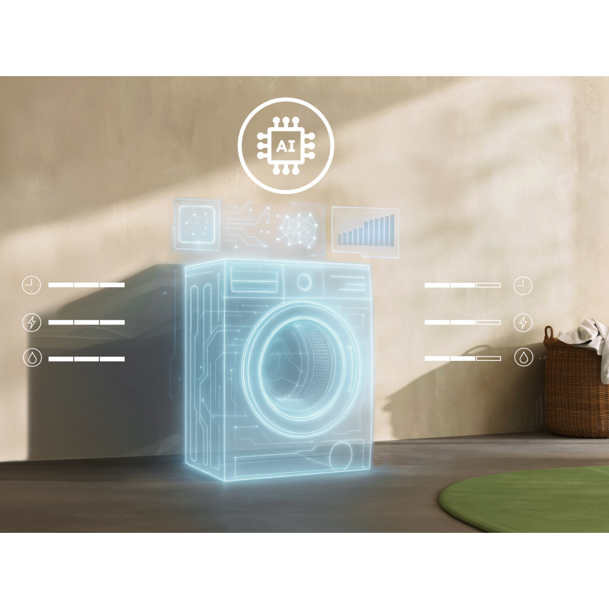 *Na základe algoritmu detekcie hmotnosti vopred trénovaného na rôznych náplniach. Na ďalšie trénovanie AI sa nepoužívajú užívateľské údaje. **Interné testovanie času, spotreby vody a energie pri 30 °C bavlnenom programe optimalizovanom pomocou AI WashAssist pre 1 kg v porovnaní s maximálnou náplňou.