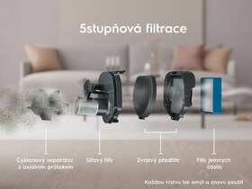K dokonalej čistote vašej domácnosti prispeje nielen účinná filtrácia, ale aj bohaté príslušenstvo. Efektívny 5-stupňový filtračný systém dokáže zachytiť až 99,99 % mikročastíc prachu. Príslušenstvo na nábytok a chúlostivé povrchy je uložené priamo na nabíjacej stanici. V závislosti od konkrétneho modelu sú vysávače vybavené aj špeciálnymi hubicami – na tvrdé podlahy, mokré čistenie, zvieraciu srsť alebo na čalúnenie a matrace.