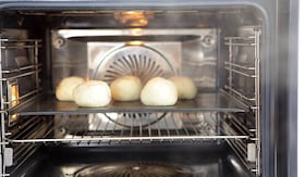 Guľaté knedličky necháme chvíľu odpočívať pod utierkou, potom ich preložíme na dierovaný plech a dáme do predhriatej rúry nastavenej na funkciu Vlhká para 96 °C, čas 15 – 20 minút. Ak chceme knedličky opäť zohriať, umiestnime ich na dierovaný plech a vložíme do predhriatej rúry nastavenej na funkciu Vlhká para 96 °C, čas 8 – 10 minút.
