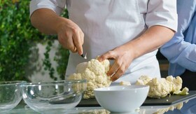 Karfiol rozdeľte na ružičky. Odkrojte celú stonku a pripravte z nej hmotu podobnú kus-kusu. Vyberte si zopár najkrajších ružičiek a nakrájajte ich na tenké plátky.