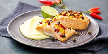 800 g filiet z lososa s kožou, 50 g sušených paradajok v olivovom oleji, 30 g kapár v náleve, 3 čili papričky, 5 ks cherry paradajok, 1 kg zemiakov, 350 ml plnotučného mlieka, 150 g masla, olivový olej, soľ