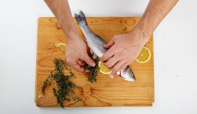 Morského vlka vypitveme a odrežeme plutvy. Kožu a šupiny na rybe necháme. Opláchneme pod tečúcou vodou a dôkladne osušíme. Do brušnej dutiny vložíme dva plátky citróna a vetvičku tymianu.