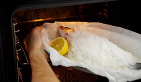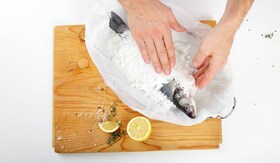 Z bielka, 50 ml vody a hrubozrnnej soli vypracujeme cestičko. Polovicu zmesi rozložíme na plechu vystlanom papierom na pečenie, do stredu položíme rybu a celú ju prikryjeme druhou polovicou soľnej zmesi.