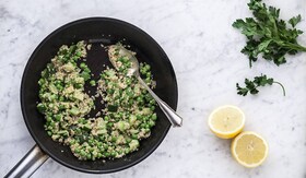 Quinou si predvaríme v osolenej vode 11 minút, scedíme a necháme vychladnúť. Cukety zbavíme koncov, pozdĺžne ich rozštvrtíme, vyrežeme mäkké stredné časti a pevné časti nakrájame na kocky cca 1 × 1 cm. V panvici si rozpustíme maslo a na ňom 2 – 3 minúty restujeme cuketu s hráškom, pridáme quinou, šťavu z citróna, soľ a restujeme ďalšie 2 minúty. Potom stiahneme z ohňa a vmiešame nasekanú mätu.