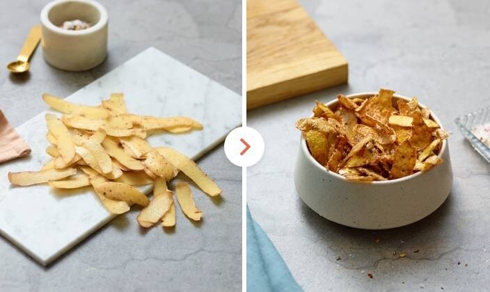 1Lupienky zo zemiakových šupiekZemiakové šupky sa pri príprave zemiakov často vyhadzujú. Namiesto toho ich skúste upiecť v rúre s kvapkou olivového oleja a štipkou soli. Doprajte svojim hosťom lahodné a chrumkavé občerstvenie ešte pred večerou.