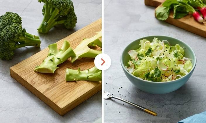 3Šalát z brokolicových stoniekStonky nevyhadzujte! Stonky nie sú tou horšou polovicou brokolice, pretože sú rovnako výživné ako ružičky. Stonky nakrájajte na plátky pomocou ostrej škrabky na zeleninu a premiešajte s obľúbenými ingredienciami do šalátu.