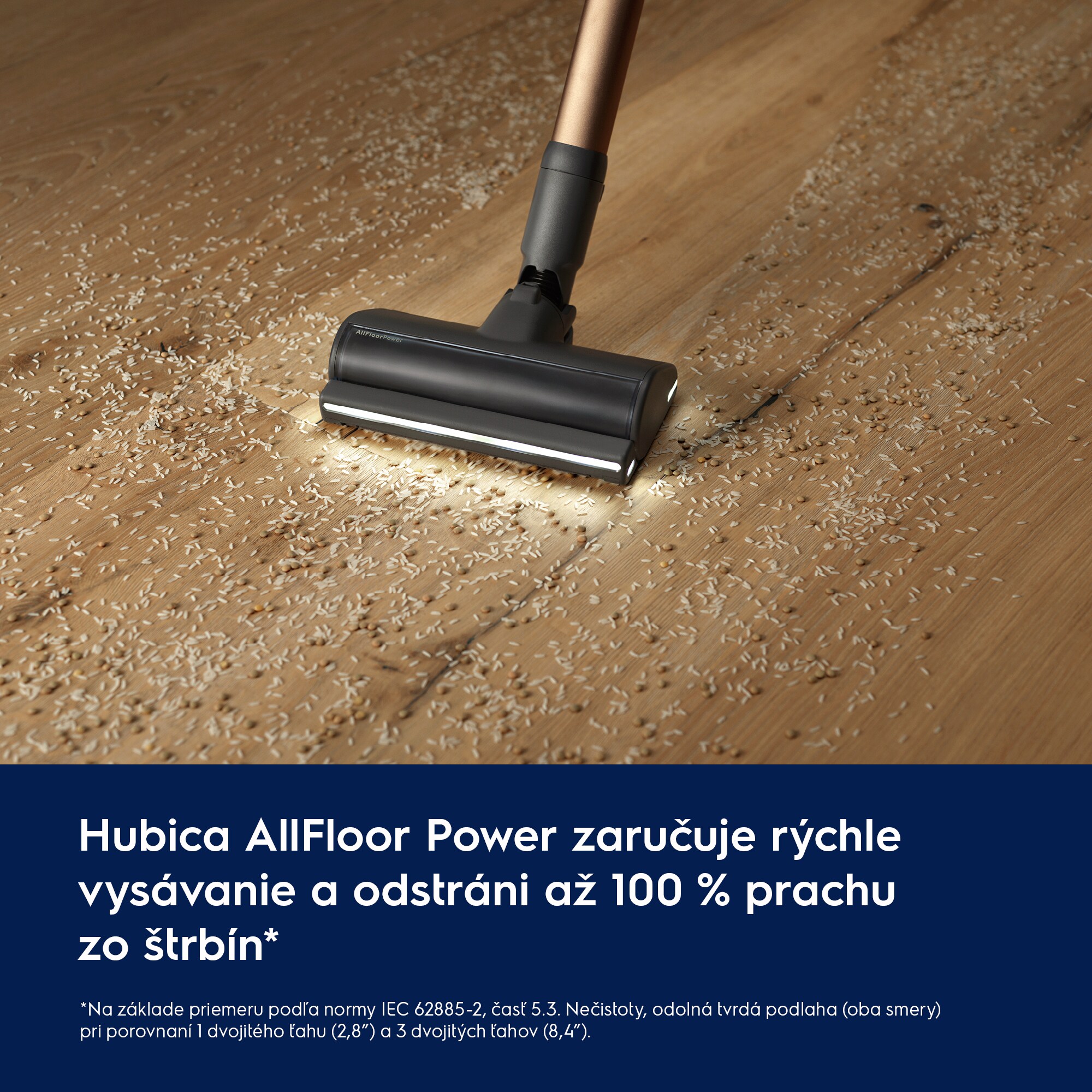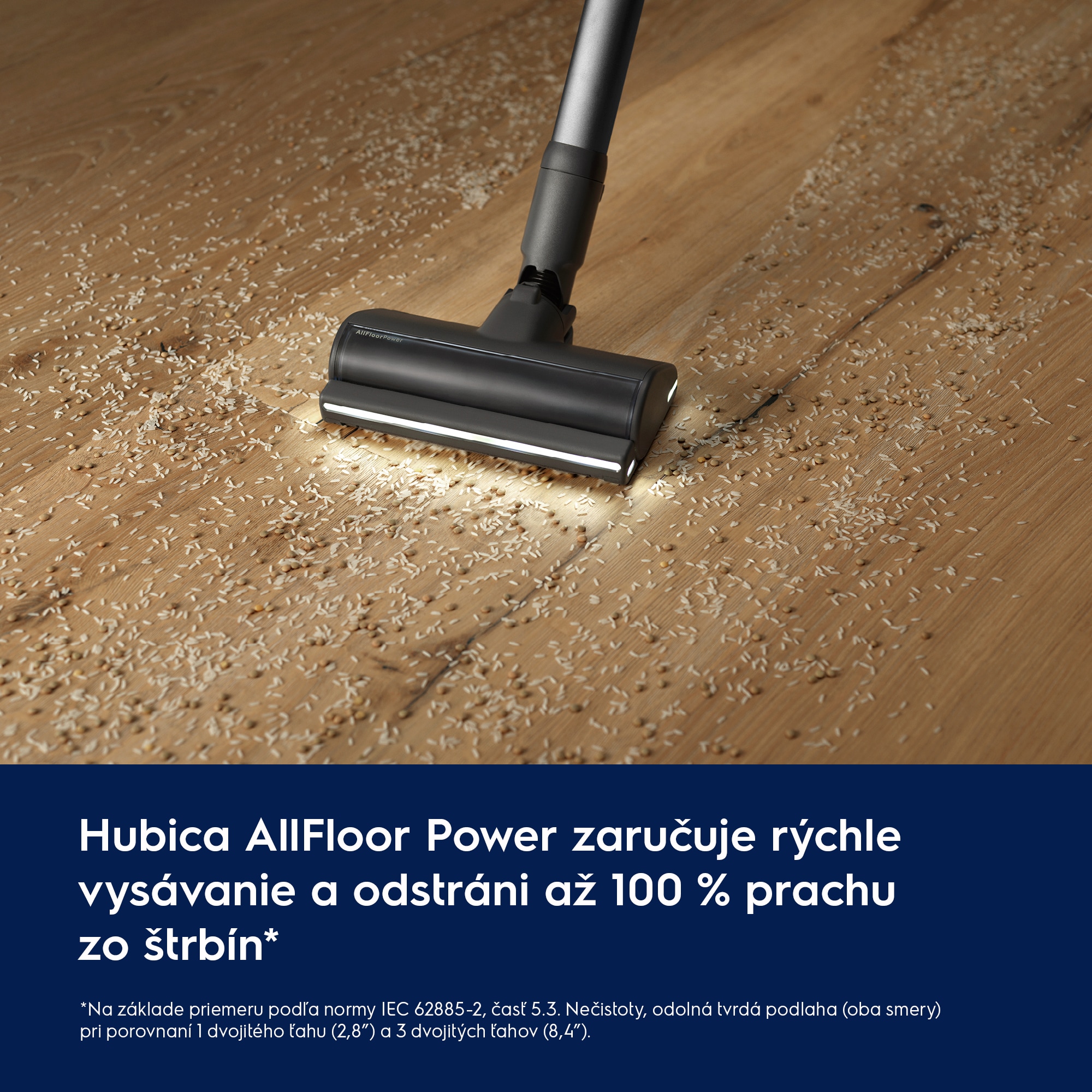 *Zachytávanie prachu testované podľa IEC 62885-2 pri zohľadnení priemerného zachytávania prachu 5.2, 5.3 (obojsmerne) na tvrdých podlahách. Výsledky podľa porovnania so šiestimi najpredávanejšími tyčovými vysávačmi s cenou nad 490 EUR v štyroch európskych krajinách (október 2024 – september 2025).