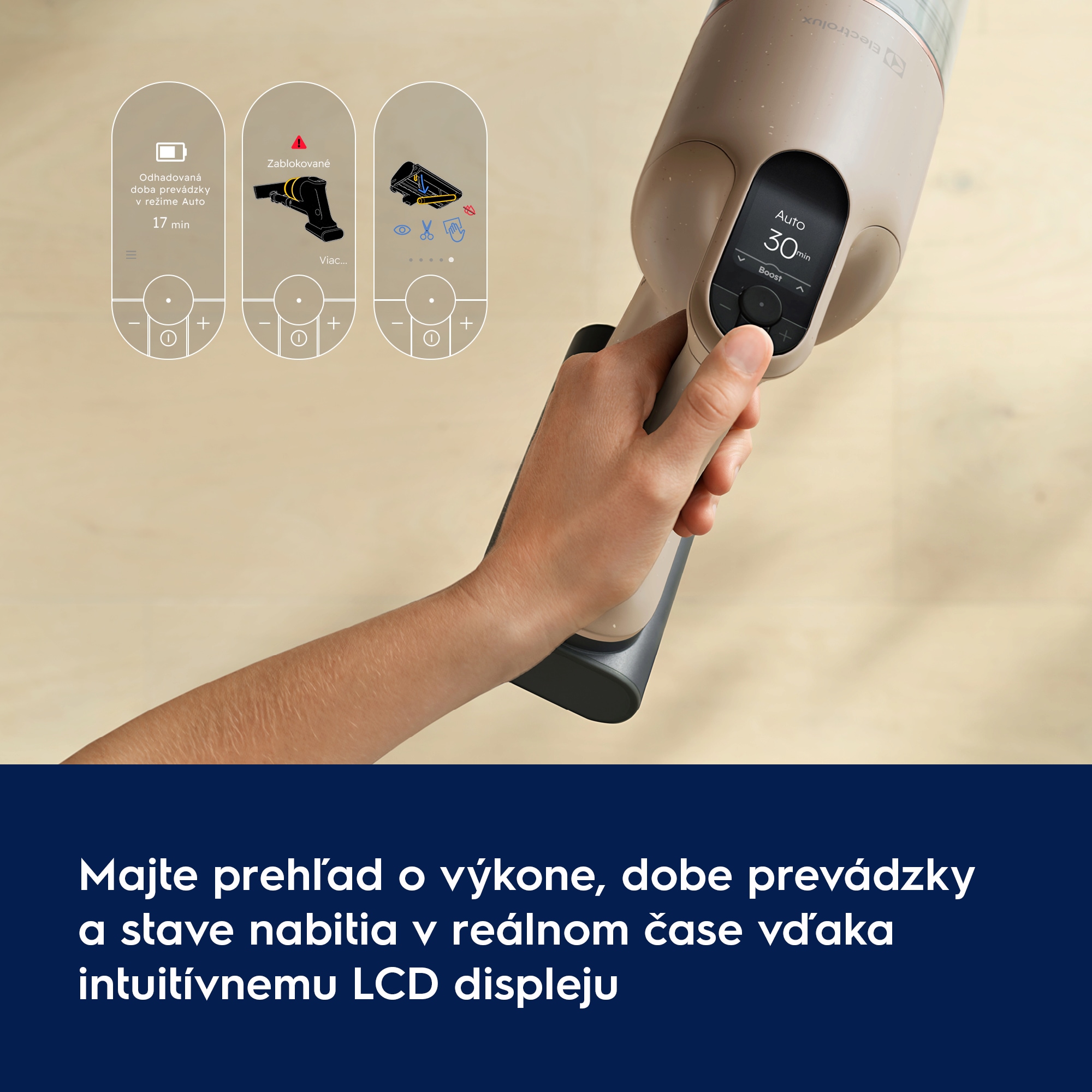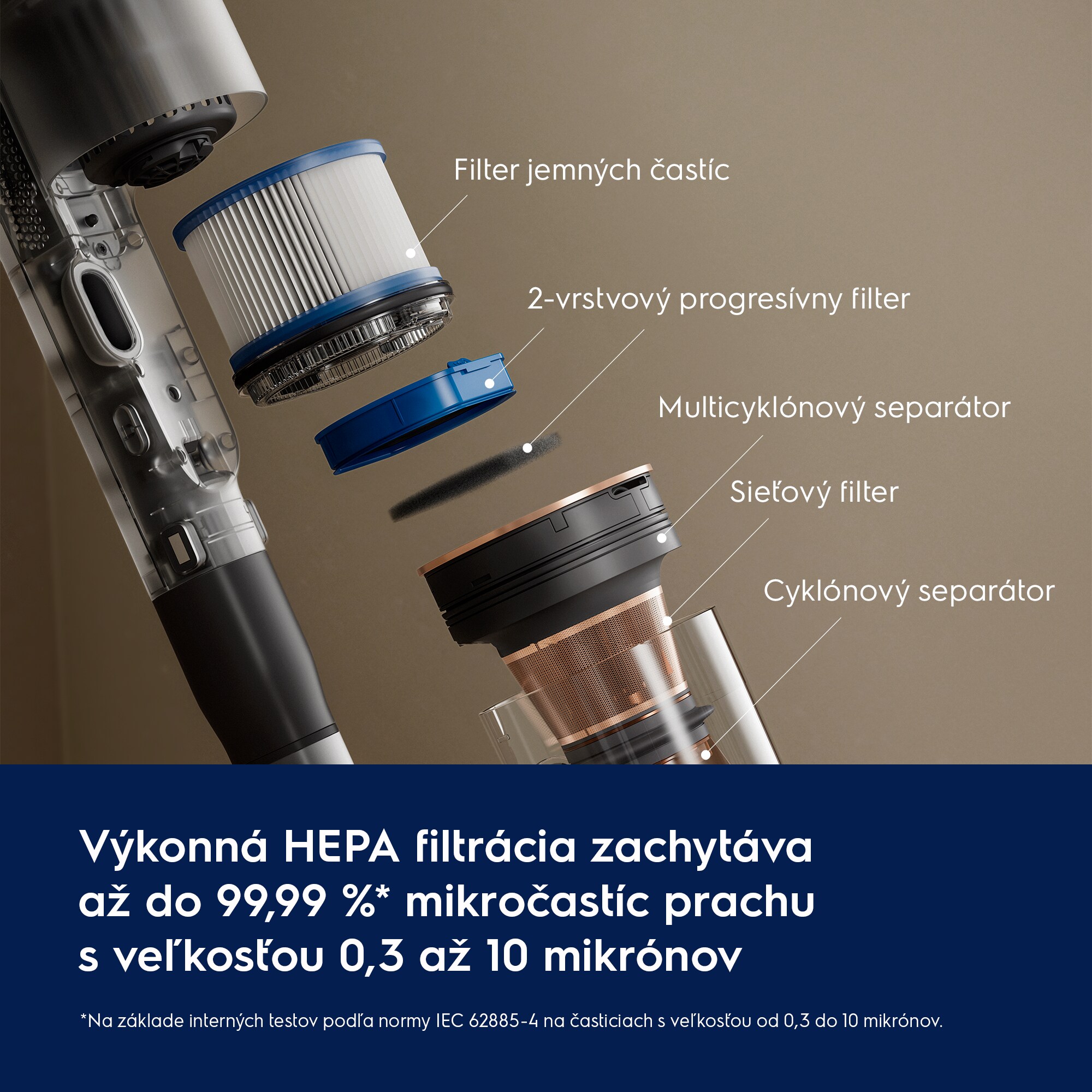 *Zachytávanie prachu testované podľa IEC 62885-2 pri zohľadnení priemerného zachytávania prachu 5.2, 5.3 (obojsmerne) na tvrdých podlahách. Výsledky podľa porovnania so šiestimi najpredávanejšími tyčovými vysávačmi s cenou nad 490 EUR v štyroch európskych krajinách (október 2024 – september 2025).