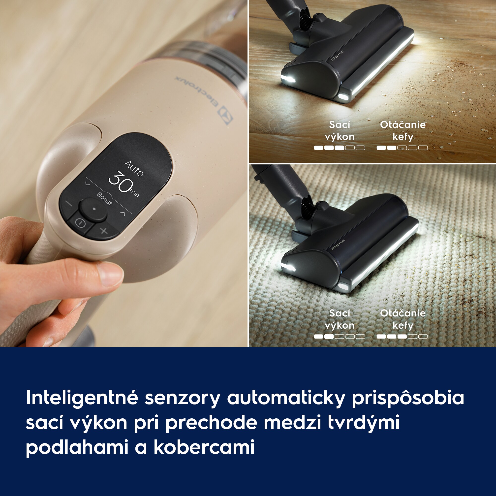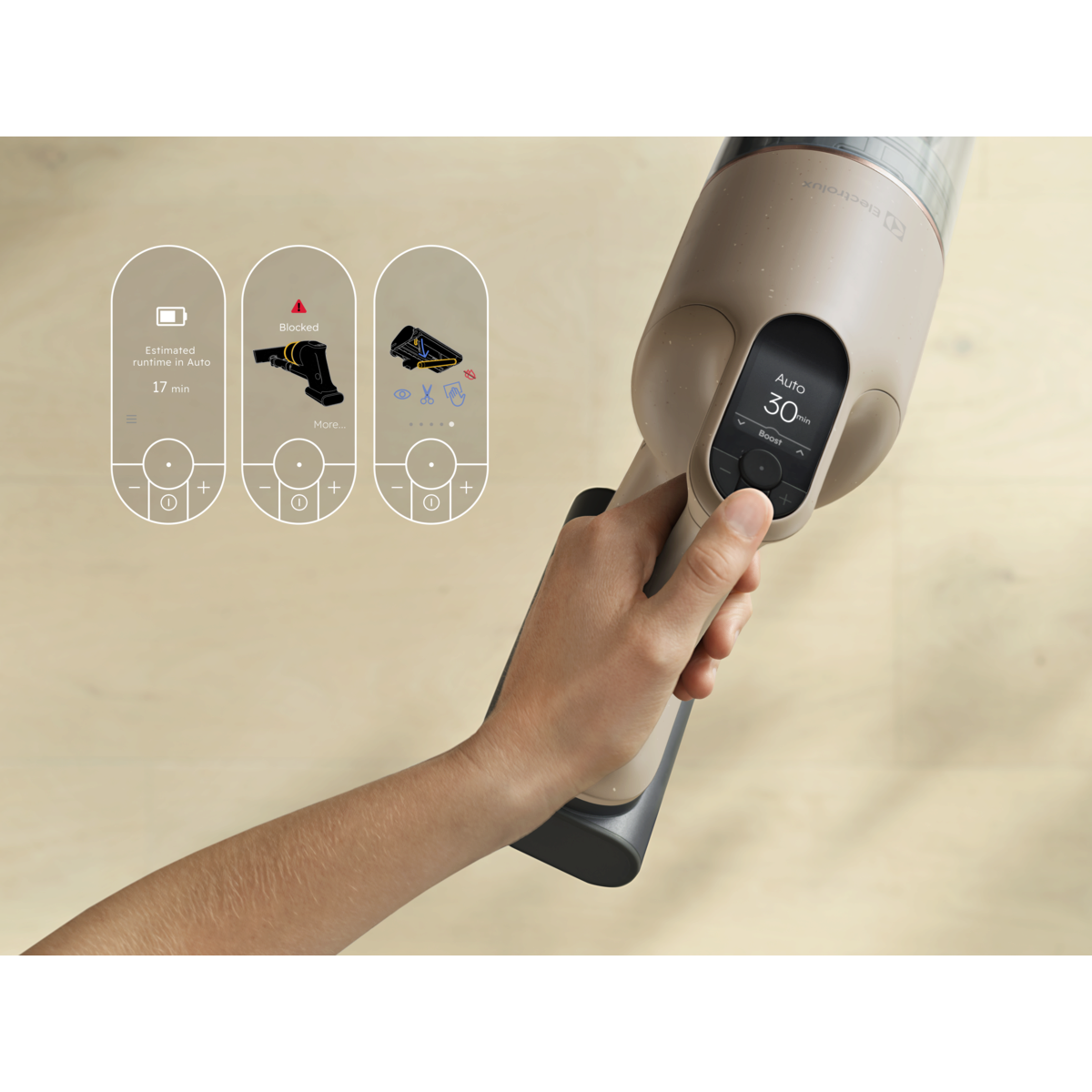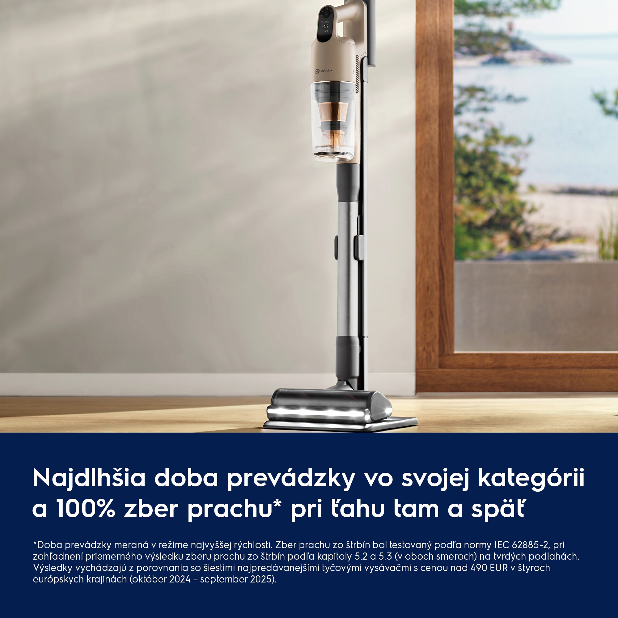 *Doba prevádzky meraná vo vysokorýchlostnom režime. Vysávanie prachu testované podľa normy IEC 62885-2 s prihliadnutím na priemerný výsledok vysávania prachu 5,2, 5,3 (v oboch smeroch) na tvrdých podlahách. Výsledky sú založené na porovnaní so šiestimi najpredávanejšími tyčovými vysávačmi s cenou nad 490 EUR v štyroch európskych krajinách (október 2024 až september 2025).