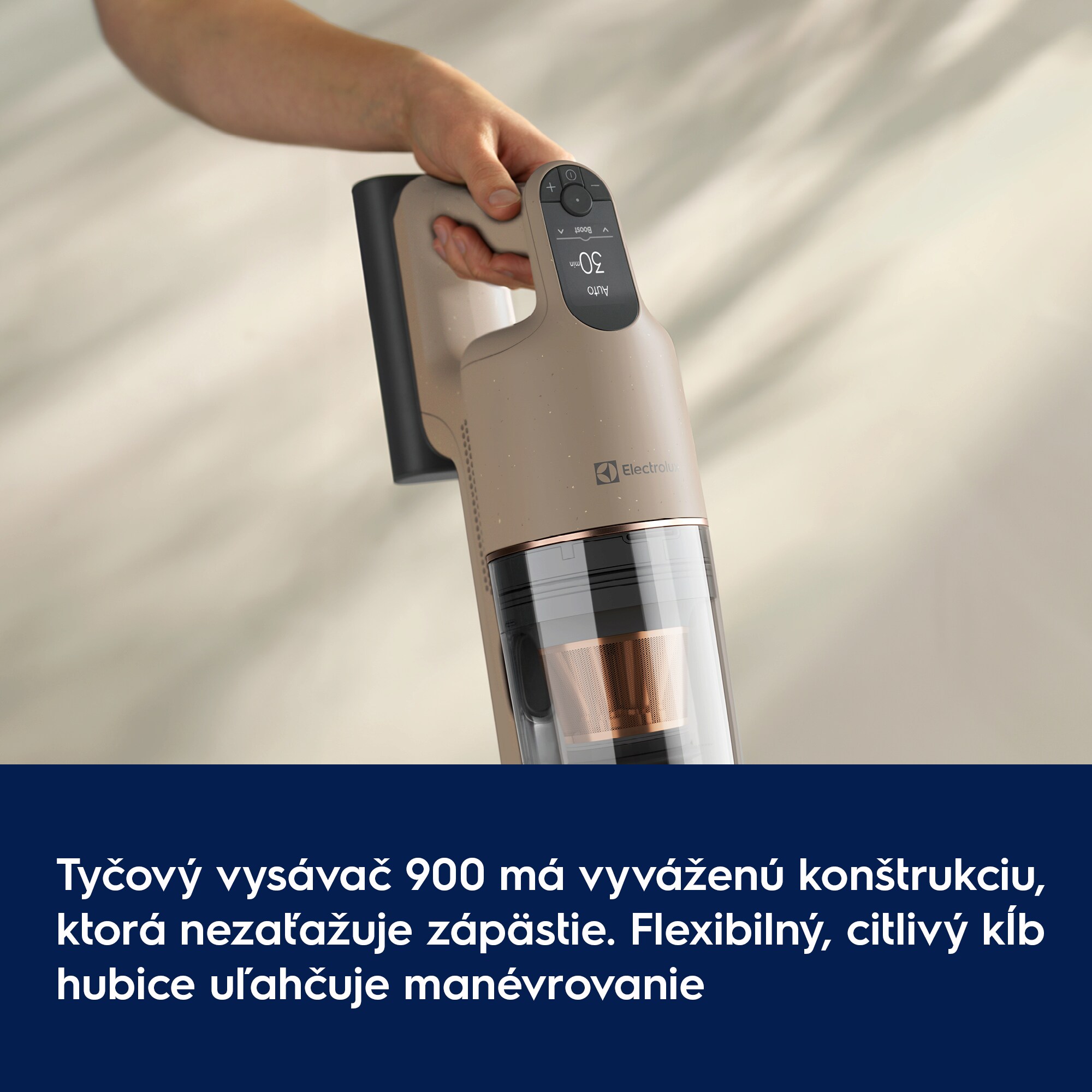 Účinnosť, ktorá pretrváva. Tyčový vysávač 900 s hubicou AllFloor Power je jediný tyčový vysávač, ktorý kombinuje najdlhšiu dobu prevádzky vo svojej triede s až 100 % zachytávaním prachu.*